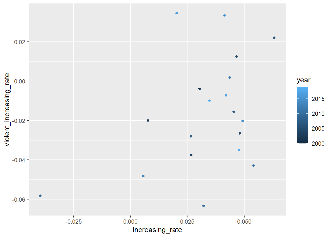 ggplot(aes(increasing_rate, violent_increasing_rate, color = year)) +