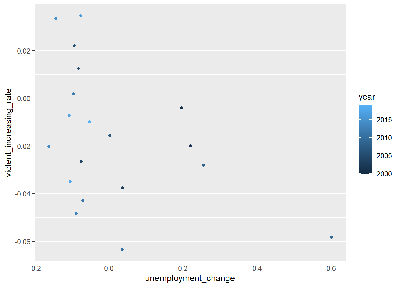 ggplot(aes(unemployment_change, violent_increasing_rate, color = year)) +