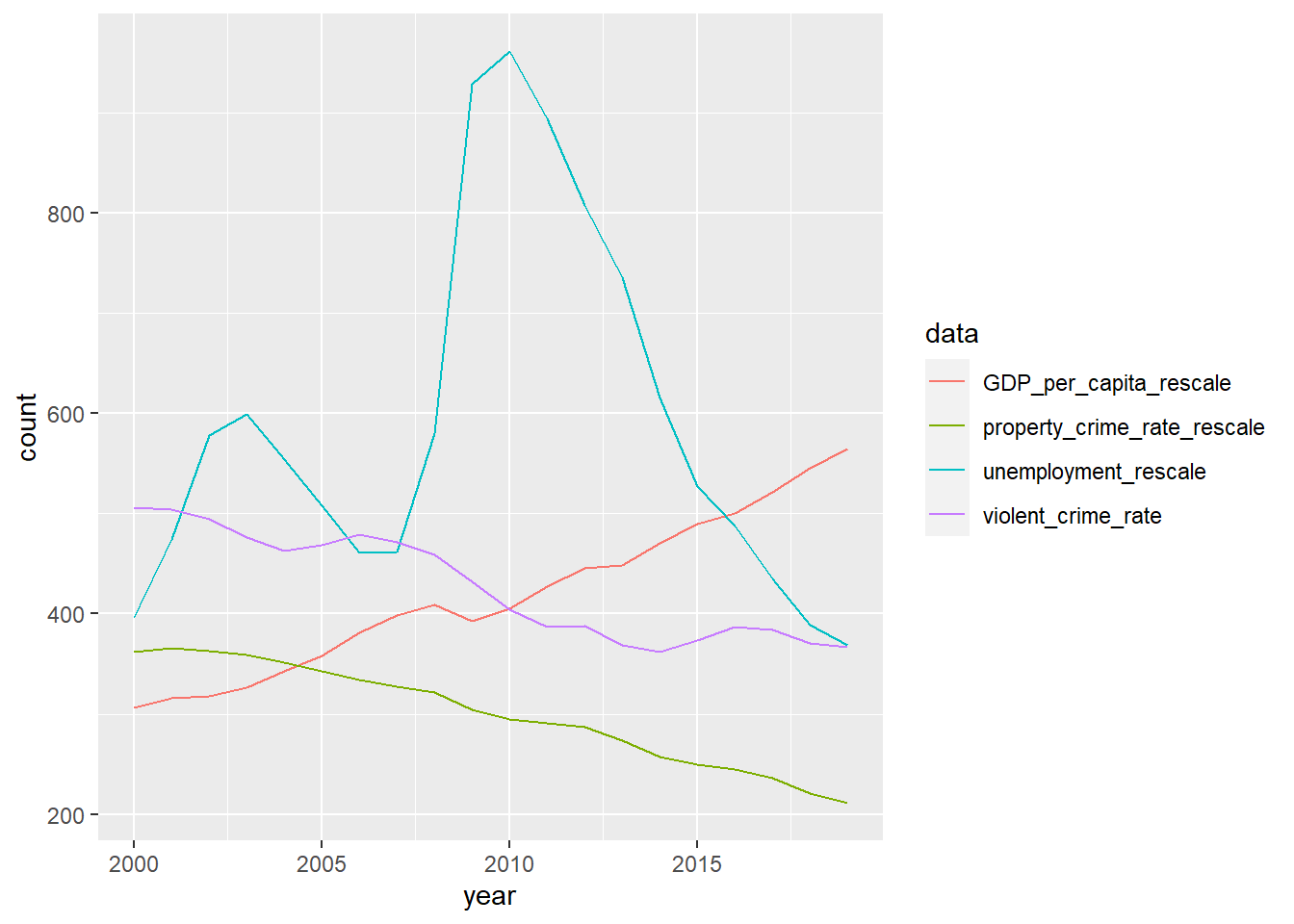 Then, we plot GDP per capita, unemployment rate, violent crime rate and property crime rate to observe if there is any relationship between GDP per capita and crime rates and if there is any pattern between unemployment rate and crime rates. Since GDP per capita is in 10^4, unemployment rates are in 10^0, violent crime rates are in 10^2, property crime rates are in 10^3, so we rescaled the variables so that we are able to observe the relationships more easily. We plot (GDP per capita / 100), (unemployment rate * 100), (property crime rate / 10) and violent crime rate, which are all in 10^2.