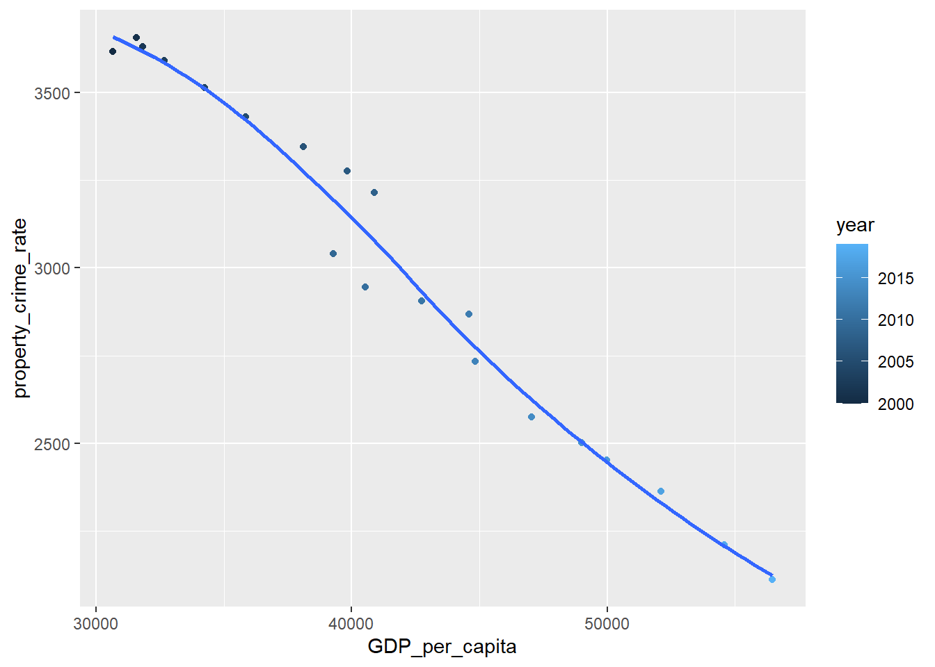 From both plots, we can see that in general, GDP per capita increases as year increases. Besides, the violent crime rate is basically decreasing as the the GDP per capita is increasing, and there’s a negative correlation between the two variables. As GDP per capita increases from 30,000 to 50,000, the violent crime rate decreases from 500 (in every 100000 people) to about 370 (in every 100000 people). However, as GDP per capita keeps increasing after 50,000, we discover that there’s a slight increment in the violent crime rate. In addition, as the GDP per capita increases, the property crime rate also decreases. This basically matches what we analyzed above.