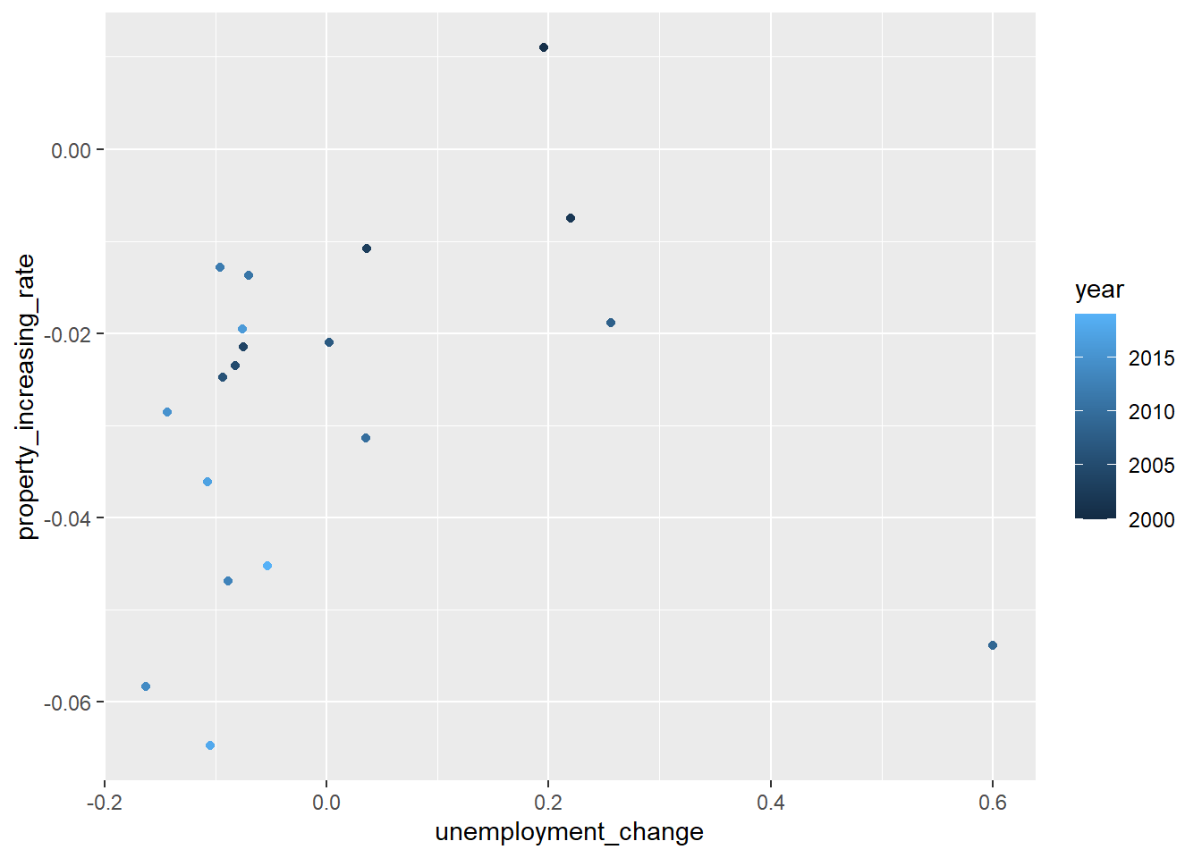 From the plot, we can see that the GDP per capita are generally increasing while both violent crime rate and property crime rate are slightly decreasing though 2000 to 2019.Therefore, when we consider the relationships between crime rates and economic indicators, we can see that as economic grows, both violent and property crime rates decrease. According to economic analysis, this is because the “incentive to engage in illegal activity decreases as legal avenues of earning income become more fruitful”(Street, “The Impact of Economic Activity on Criminal Behavior”). It would easier to earn a living so the general crime rate decreases as economic grows. But when we consider the relationship between crime rate and unemployment rate, the relationship is harder to find. and there’s not a specific pattern to describe their relationship.(References: The Center for Growth and OPPortunity. Accessed 26 March 26 2021.).